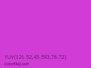 YUV 121.52,45.593,76.72 Color is a normal magenta color and the nearest color is Steel Pink #cc33cc. Hex code #d13bd6 and RGB value is rgb(209,59,214). In RGB color space, this color is composed of 82% red, 23% green, 84% blue, In CMYK color space, this color is composed of 2% cyan, 72% magenta, 0% yellow , 16% black , In HSL color space, this color has a hue angle of 298° , 65% saturation and 54% lightness.