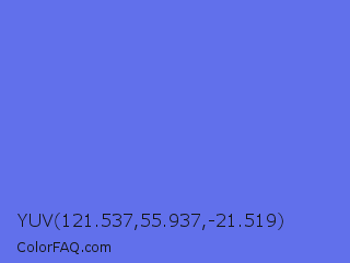 YUV 121.537,55.937,-21.519 Color is a light blue color and the nearest color is Very Light Blue #6666ff. Hex code #6170eb and RGB value is rgb(97,112,235). In RGB color space, this color is composed of 38% red, 44% green, 92% blue, In CMYK color space, this color is composed of 59% cyan, 52% magenta, 0% yellow , 8% black , In HSL color space, this color has a hue angle of 233° , 78% saturation and 65% lightness.