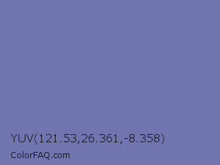 YUV 121.53,26.361,-8.358 Color is a normal blue color and the nearest color is Kimberly #736c9f. Hex code #7074af and RGB value is rgb(112,116,175). In RGB color space, this color is composed of 44% red, 45% green, 69% blue, In CMYK color space, this color is composed of 36% cyan, 34% magenta, 0% yellow , 31% black , In HSL color space, this color has a hue angle of 236° , 28% saturation and 56% lightness.