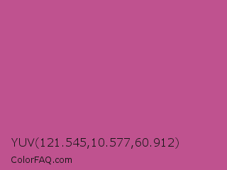 YUV 121.545,10.577,60.912 Color is a normal magenta color and the nearest color is Mulberry #c54b8c. Hex code #bf528f and RGB value is rgb(191,82,143). In RGB color space, this color is composed of 75% red, 32% green, 56% blue, In CMYK color space, this color is composed of 0% cyan, 57% magenta, 25% yellow , 25% black , In HSL color space, this color has a hue angle of 326° , 46% saturation and 54% lightness.