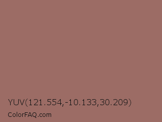 YUV 121.554,-10.133,30.209 Color is a normal red color and the nearest color is Toast #9a6e61. Hex code #9c6c65 and RGB value is rgb(156,108,101). In RGB color space, this color is composed of 61% red, 42% green, 40% blue, In CMYK color space, this color is composed of 0% cyan, 31% magenta, 35% yellow , 39% black , In HSL color space, this color has a hue angle of 8° , 22% saturation and 50% lightness.