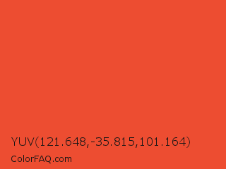 YUV 121.648,-35.815,101.164 Color is a normal red color and the nearest color is Flamingo #f2552a. Hex code #ed4d31 and RGB value is rgb(237,77,49). In RGB color space, this color is composed of 93% red, 30% green, 19% blue, In CMYK color space, this color is composed of 0% cyan, 68% magenta, 79% yellow , 7% black , In HSL color space, this color has a hue angle of 9° , 84% saturation and 56% lightness.