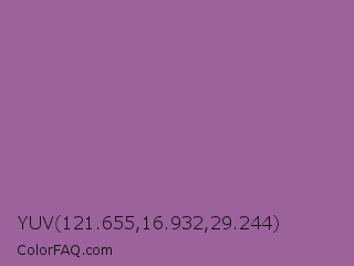 YUV 121.655,16.932,29.244 Color is a normal magenta color and the nearest color is Trendy Pink #8c6495. Hex code #9b629c and RGB value is rgb(155,98,156). In RGB color space, this color is composed of 61% red, 38% green, 61% blue, In CMYK color space, this color is composed of 1% cyan, 37% magenta, 0% yellow , 39% black , In HSL color space, this color has a hue angle of 299° , 23% saturation and 50% lightness.