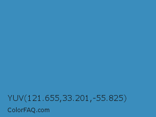 YUV 121.655,33.201,-55.825 Color is a normal blue color and the nearest color is Boston Blue #3b91b4. Hex code #3a8dbd and RGB value is rgb(58,141,189). In RGB color space, this color is composed of 23% red, 55% green, 74% blue, In CMYK color space, this color is composed of 69% cyan, 25% magenta, 0% yellow , 26% black , In HSL color space, this color has a hue angle of 202° , 53% saturation and 48% lightness.