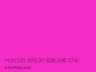 YUV 121.655,37.638,108.174 Color is a normal magenta color and the nearest color is Razzle Dazzle Rose #ff33cc. Hex code #f52cc6 and RGB value is rgb(245,44,198). In RGB color space, this color is composed of 96% red, 17% green, 78% blue, In CMYK color space, this color is composed of 0% cyan, 82% magenta, 19% yellow , 4% black , In HSL color space, this color has a hue angle of 314° , 91% saturation and 57% lightness.