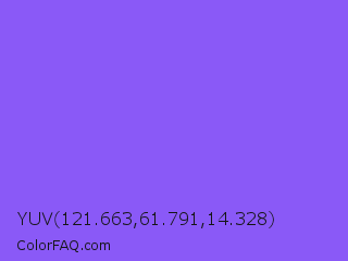 YUV 121.663,61.791,14.328 Color is a light indigo color and the nearest color is Navy Purple #9457eb. Hex code #8a59f7 and RGB value is rgb(138,89,247). In RGB color space, this color is composed of 54% red, 35% green, 97% blue, In CMYK color space, this color is composed of 44% cyan, 64% magenta, 0% yellow , 3% black , In HSL color space, this color has a hue angle of 259° , 91% saturation and 66% lightness.