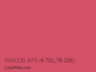 YUV 121.677,-9.701,78.336 Color is a normal red color and the nearest color is Dark Terra Cotta #cc4e5c. Hex code #d35066 and RGB value is rgb(211,80,102). In RGB color space, this color is composed of 83% red, 31% green, 40% blue, In CMYK color space, this color is composed of 0% cyan, 62% magenta, 52% yellow , 17% black , In HSL color space, this color has a hue angle of 350° , 60% saturation and 57% lightness.