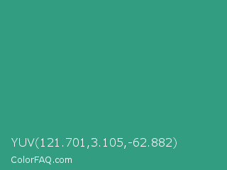 YUV 121.701,3.105,-62.882 Color is a normal cyan color and the nearest color is Illuminating Emerald #319177. Hex code #329d80 and RGB value is rgb(50,157,128). In RGB color space, this color is composed of 20% red, 62% green, 50% blue, In CMYK color space, this color is composed of 68% cyan, 0% magenta, 18% yellow , 38% black , In HSL color space, this color has a hue angle of 164° , 52% saturation and 41% lightness.