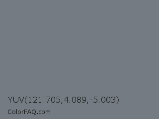 YUV 121.705,4.089,-5.003 Color is a normal blue color and the nearest color is Rolling Stone #747d83. Hex code #747b82 and RGB value is rgb(116,123,130). In RGB color space, this color is composed of 45% red, 48% green, 51% blue, In CMYK color space, this color is composed of 11% cyan, 5% magenta, 0% yellow , 49% black , In HSL color space, this color has a hue angle of 210° , 6% saturation and 48% lightness.