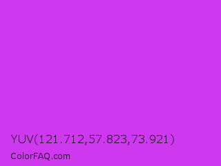YUV 121.712,57.823,73.921 Color is a normal purple color and the nearest color is Steel Pink #cc33cc. Hex code #ce38ef and RGB value is rgb(206,56,239). In RGB color space, this color is composed of 81% red, 22% green, 94% blue, In CMYK color space, this color is composed of 14% cyan, 77% magenta, 0% yellow , 6% black , In HSL color space, this color has a hue angle of 289° , 85% saturation and 58% lightness.