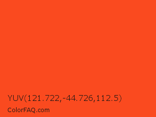 YUV 121.722,-44.726,112.5 Color is a normal red color and the nearest color is Pomegranate #f34723. Hex code #fa4a1f and RGB value is rgb(250,74,31). In RGB color space, this color is composed of 98% red, 29% green, 12% blue, In CMYK color space, this color is composed of 0% cyan, 70% magenta, 88% yellow , 2% black , In HSL color space, this color has a hue angle of 12° , 96% saturation and 55% lightness.