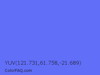 YUV 121.731,61.758,-21.689 Color is a light blue color and the nearest color is Very Light Blue #6666ff. Hex code #616ef7 and RGB value is rgb(97,110,247). In RGB color space, this color is composed of 38% red, 43% green, 97% blue, In CMYK color space, this color is composed of 61% cyan, 55% magenta, 0% yellow , 3% black , In HSL color space, this color has a hue angle of 235° , 90% saturation and 67% lightness.