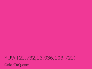YUV 121.732,13.936,103.721 Color is a normal rose color and the nearest color is French Fuchsia #fd3f92. Hex code #f03896 and RGB value is rgb(240,56,150). In RGB color space, this color is composed of 94% red, 22% green, 59% blue, In CMYK color space, this color is composed of 0% cyan, 77% magenta, 38% yellow , 6% black , In HSL color space, this color has a hue angle of 329° , 86% saturation and 58% lightness.