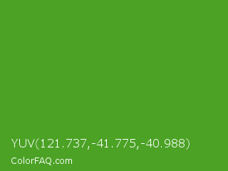 YUV 121.737,-41.775,-40.988 Color is a normal green color and the nearest color is Vida Loca #549019. Hex code #4ba225 and RGB value is rgb(75,162,37). In RGB color space, this color is composed of 29% red, 64% green, 15% blue, In CMYK color space, this color is composed of 54% cyan, 0% magenta, 77% yellow , 36% black , In HSL color space, this color has a hue angle of 102° , 63% saturation and 39% lightness.