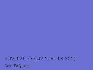 YUV 121.737,42.528,-13.801 Color is a light blue color and the nearest color is Blue Marguerite #7666c6. Hex code #6a71d0 and RGB value is rgb(106,113,208). In RGB color space, this color is composed of 42% red, 44% green, 82% blue, In CMYK color space, this color is composed of 49% cyan, 46% magenta, 0% yellow , 18% black , In HSL color space, this color has a hue angle of 236° , 52% saturation and 62% lightness.