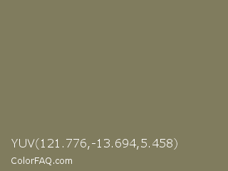 YUV 121.776,-13.694,5.458 Color is a normal yellow color and the nearest color is Shadow #8a795d. Hex code #807c5e and RGB value is rgb(128,124,94). In RGB color space, this color is composed of 50% red, 49% green, 37% blue, In CMYK color space, this color is composed of 0% cyan, 3% magenta, 27% yellow , 50% black , In HSL color space, this color has a hue angle of 53° , 15% saturation and 44% lightness.