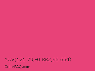 YUV 121.79,-0.882,96.654 Color is a normal rose color and the nearest color is Cerise Pink #ec3b83. Hex code #e84278 and RGB value is rgb(232,66,120). In RGB color space, this color is composed of 91% red, 26% green, 47% blue, In CMYK color space, this color is composed of 0% cyan, 72% magenta, 48% yellow , 9% black , In HSL color space, this color has a hue angle of 340° , 78% saturation and 58% lightness.