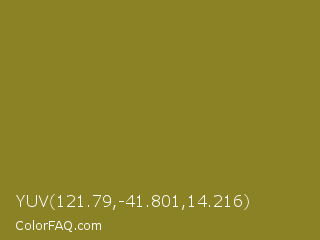 YUV 121.79,-41.801,14.216 Color is a normal yellow color and the nearest color is Hacienda #98811b. Hex code #8a8225 and RGB value is rgb(138,130,37). In RGB color space, this color is composed of 54% red, 51% green, 15% blue, In CMYK color space, this color is composed of 0% cyan, 6% magenta, 73% yellow , 46% black , In HSL color space, this color has a hue angle of 55° , 58% saturation and 34% lightness.