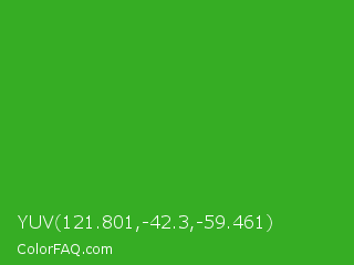 YUV 121.801,-42.3,-59.461 Color is a normal green color and the nearest color is Wageningen Green #34b233. Hex code #36ad24 and RGB value is rgb(54,173,36). In RGB color space, this color is composed of 21% red, 68% green, 14% blue, In CMYK color space, this color is composed of 69% cyan, 0% magenta, 79% yellow , 32% black , In HSL color space, this color has a hue angle of 112° , 66% saturation and 41% lightness.