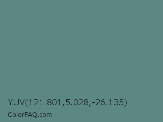 YUV 121.801,5.028,-26.135 Color is a normal cyan color and the nearest color is Steel Teal #5f8a8b. Hex code #5c8784 and RGB value is rgb(92,135,132). In RGB color space, this color is composed of 36% red, 53% green, 52% blue, In CMYK color space, this color is composed of 32% cyan, 0% magenta, 2% yellow , 47% black , In HSL color space, this color has a hue angle of 176° , 19% saturation and 45% lightness.