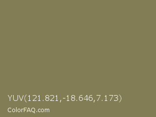 YUV 121.821,-18.646,7.173 Color is a normal yellow color and the nearest color is Gold Fusion #85754e. Hex code #827d54 and RGB value is rgb(130,125,84). In RGB color space, this color is composed of 51% red, 49% green, 33% blue, In CMYK color space, this color is composed of 0% cyan, 4% magenta, 35% yellow , 49% black , In HSL color space, this color has a hue angle of 53° , 21% saturation and 42% lightness.