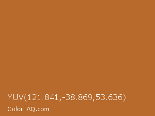 YUV 121.841,-38.869,53.636 Color is a normal orange color and the nearest color is Liver Dogs #b86d29. Hex code #b76a2b and RGB value is rgb(183,106,43). In RGB color space, this color is composed of 72% red, 42% green, 17% blue, In CMYK color space, this color is composed of 0% cyan, 42% magenta, 77% yellow , 28% black , In HSL color space, this color has a hue angle of 27° , 62% saturation and 44% lightness.
