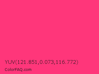 YUV 121.851,0.073,116.772 Color is a light rose color and the nearest color is Sasquatch Socks #ff4681. Hex code #ff367a and RGB value is rgb(255,54,122). In RGB color space, this color is composed of 100% red, 21% green, 48% blue, In CMYK color space, this color is composed of 0% cyan, 79% magenta, 52% yellow , 0% black , In HSL color space, this color has a hue angle of 340° , 100% saturation and 61% lightness.