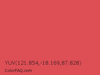 YUV 121.854,-18.169,87.828 Color is a normal red color and the nearest color is Mandy #e25465. Hex code #de4e55 and RGB value is rgb(222,78,85). In RGB color space, this color is composed of 87% red, 31% green, 33% blue, In CMYK color space, this color is composed of 0% cyan, 65% magenta, 62% yellow , 13% black , In HSL color space, this color has a hue angle of 357° , 69% saturation and 59% lightness.