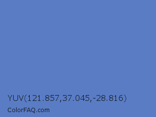 YUV 121.857,37.045,-28.816 Color is a normal blue color and the nearest color is Silver Lake Blue #5d89ba. Hex code #597cc5 and RGB value is rgb(89,124,197). In RGB color space, this color is composed of 35% red, 49% green, 77% blue, In CMYK color space, this color is composed of 55% cyan, 37% magenta, 0% yellow , 23% black , In HSL color space, this color has a hue angle of 221° , 48% saturation and 56% lightness.