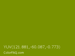 YUV 121.881,-60.087,-0.773 Color is a dark yellow color and the nearest color is Limeade #6f9d02. Hex code #799200 and RGB value is rgb(121,146,-0). In RGB color space, this color is composed of 47% red, 57% green, 0% blue, In CMYK color space, this color is composed of 17% cyan, 0% magenta, 100% yellow , 43% black , In HSL color space, this color has a hue angle of 70° , 100% saturation and 29% lightness.