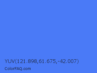 YUV 121.898,61.675,-42.007 Color is a light blue color and the nearest color is Blueberry #4f86f7. Hex code #4a7af7 and RGB value is rgb(74,122,247). In RGB color space, this color is composed of 29% red, 48% green, 97% blue, In CMYK color space, this color is composed of 70% cyan, 51% magenta, 0% yellow , 3% black , In HSL color space, this color has a hue angle of 223° , 92% saturation and 63% lightness.