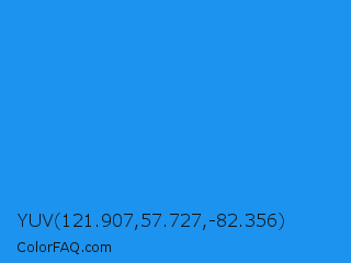 YUV 121.907,57.727,-82.356 Color is a normal blue color and the nearest color is Button Blue #24a0ed. Hex code #1c93ef and RGB value is rgb(28,147,239). In RGB color space, this color is composed of 11% red, 58% green, 94% blue, In CMYK color space, this color is composed of 88% cyan, 38% magenta, 0% yellow , 6% black , In HSL color space, this color has a hue angle of 206° , 87% saturation and 52% lightness.