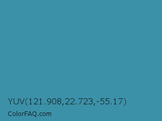 YUV 121.908,22.723,-55.17 Color is a normal cyan color and the nearest color is Boston Blue #3b91b4. Hex code #3b91a8 and RGB value is rgb(59,145,168). In RGB color space, this color is composed of 23% red, 57% green, 66% blue, In CMYK color space, this color is composed of 65% cyan, 14% magenta, 0% yellow , 34% black , In HSL color space, this color has a hue angle of 193° , 48% saturation and 45% lightness.