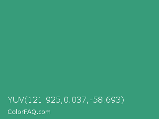 YUV 121.925,0.037,-58.693 Color is a normal green color and the nearest color is Illuminating Emerald #319177. Hex code #379c7a and RGB value is rgb(55,156,122). In RGB color space, this color is composed of 22% red, 61% green, 48% blue, In CMYK color space, this color is composed of 65% cyan, 0% magenta, 22% yellow , 39% black , In HSL color space, this color has a hue angle of 160° , 48% saturation and 41% lightness.