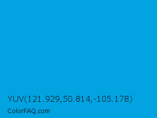 YUV 121.929,50.814,-105.178 Color is a normal blue color and the nearest color is Cerulean #02a4d3. Hex code #02a3e1 and RGB value is rgb(2,163,225). In RGB color space, this color is composed of 1% red, 64% green, 88% blue, In CMYK color space, this color is composed of 99% cyan, 28% magenta, 0% yellow , 12% black , In HSL color space, this color has a hue angle of 197° , 98% saturation and 45% lightness.