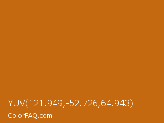 YUV 121.949,-52.726,64.943 Color is a normal orange color and the nearest color is Alloy Orange #c46210. Hex code #c4690f and RGB value is rgb(196,105,15). In RGB color space, this color is composed of 77% red, 41% green, 6% blue, In CMYK color space, this color is composed of 0% cyan, 46% magenta, 92% yellow , 23% black , In HSL color space, this color has a hue angle of 30° , 86% saturation and 41% lightness.