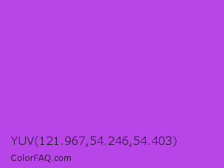 YUV 121.967,54.246,54.403 Color is a normal purple color and the nearest color is Medium Orchid #ba55d3. Hex code #b845e8 and RGB value is rgb(184,69,232). In RGB color space, this color is composed of 72% red, 27% green, 91% blue, In CMYK color space, this color is composed of 21% cyan, 70% magenta, 0% yellow , 9% black , In HSL color space, this color has a hue angle of 282° , 78% saturation and 59% lightness.