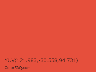 YUV 121.983,-30.558,94.731 Color is a normal red color and the nearest color is Carmine Pink #eb4c42. Hex code #e64f3c and RGB value is rgb(230,79,60). In RGB color space, this color is composed of 90% red, 31% green, 24% blue, In CMYK color space, this color is composed of 0% cyan, 66% magenta, 74% yellow , 10% black , In HSL color space, this color has a hue angle of 7° , 77% saturation and 57% lightness.