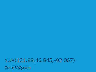 YUV 121.98,46.845,-92.067 Color is a normal blue color and the nearest color is Rich Electric Blue #0892d0. Hex code #119dd9 and RGB value is rgb(17,157,217). In RGB color space, this color is composed of 7% red, 62% green, 85% blue, In CMYK color space, this color is composed of 92% cyan, 28% magenta, 0% yellow , 15% black , In HSL color space, this color has a hue angle of 198° , 85% saturation and 46% lightness.