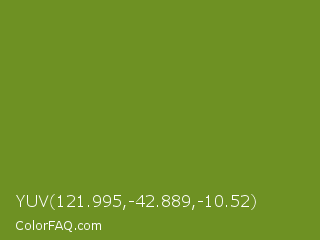 YUV 121.995,-42.889,-10.52 Color is a normal lime color and the nearest color is Olive Drab #6b8e23. Hex code #6e9123 and RGB value is rgb(110,145,35). In RGB color space, this color is composed of 43% red, 57% green, 14% blue, In CMYK color space, this color is composed of 24% cyan, 0% magenta, 76% yellow , 43% black , In HSL color space, this color has a hue angle of 79° , 61% saturation and 35% lightness.