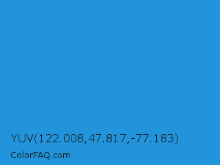YUV 122.008,47.817,-77.183 Color is a normal blue color and the nearest color is Curious Blue #2596d1. Hex code #2294db and RGB value is rgb(34,148,219). In RGB color space, this color is composed of 13% red, 58% green, 86% blue, In CMYK color space, this color is composed of 84% cyan, 32% magenta, 0% yellow , 14% black , In HSL color space, this color has a hue angle of 203° , 73% saturation and 50% lightness.