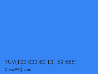 YUV 122.033,60.13,-59.665 Color is a normal blue color and the nearest color is Bleu De France #318ce7. Hex code #3685f4 and RGB value is rgb(54,133,244). In RGB color space, this color is composed of 21% red, 52% green, 96% blue, In CMYK color space, this color is composed of 78% cyan, 45% magenta, 0% yellow , 4% black , In HSL color space, this color has a hue angle of 215° , 90% saturation and 58% lightness.