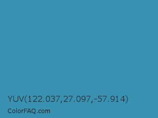 YUV 122.037,27.097,-57.914 Color is a normal blue color and the nearest color is Boston Blue #3b91b4. Hex code #3891b1 and RGB value is rgb(56,145,177). In RGB color space, this color is composed of 22% red, 57% green, 69% blue, In CMYK color space, this color is composed of 68% cyan, 18% magenta, 0% yellow , 31% black , In HSL color space, this color has a hue angle of 196° , 52% saturation and 46% lightness.