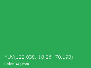 YUV 122.038,-18.26,-70.193 Color is a normal green color and the nearest color is Chateau Green #40a860. Hex code #2aaa55 and RGB value is rgb(42,170,85). In RGB color space, this color is composed of 16% red, 67% green, 33% blue, In CMYK color space, this color is composed of 75% cyan, 0% magenta, 50% yellow , 33% black , In HSL color space, this color has a hue angle of 140° , 60% saturation and 42% lightness.