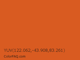 YUV 122.062,-43.908,83.261 Color is a normal orange color and the nearest color is Vivid Red Tangelo #df6124. Hex code #d95b21 and RGB value is rgb(217,91,33). In RGB color space, this color is composed of 85% red, 36% green, 13% blue, In CMYK color space, this color is composed of 0% cyan, 58% magenta, 85% yellow , 15% black , In HSL color space, this color has a hue angle of 19° , 74% saturation and 49% lightness.