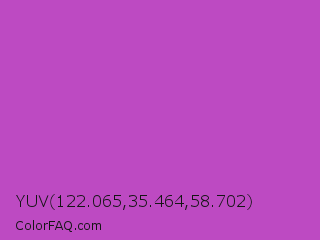 YUV 122.065,35.464,58.702 Color is a normal magenta color and the nearest color is Fuchsia Pink #c154c1. Hex code #bd4ac2 and RGB value is rgb(189,74,194). In RGB color space, this color is composed of 74% red, 29% green, 76% blue, In CMYK color space, this color is composed of 3% cyan, 62% magenta, 0% yellow , 24% black , In HSL color space, this color has a hue angle of 298° , 50% saturation and 53% lightness.