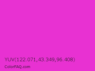YUV 122.071,43.349,96.408 Color is a normal magenta color and the nearest color is Razzle Dazzle Rose #ff33cc. Hex code #e831d2 and RGB value is rgb(232,49,210). In RGB color space, this color is composed of 91% red, 19% green, 82% blue, In CMYK color space, this color is composed of 0% cyan, 79% magenta, 9% yellow , 9% black , In HSL color space, this color has a hue angle of 307° , 80% saturation and 55% lightness.