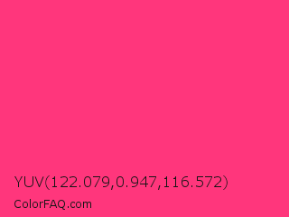 YUV 122.079,0.947,116.572 Color is a light rose color and the nearest color is Sasquatch Socks #ff4681. Hex code #ff367c and RGB value is rgb(255,54,124). In RGB color space, this color is composed of 100% red, 21% green, 49% blue, In CMYK color space, this color is composed of 0% cyan, 79% magenta, 51% yellow , 0% black , In HSL color space, this color has a hue angle of 339° , 100% saturation and 61% lightness.