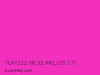 YUV 122.08,32.992,105.17 Color is a normal magenta color and the nearest color is Razzle Dazzle Rose #ff33cc. Hex code #f230bd and RGB value is rgb(242,48,189). In RGB color space, this color is composed of 95% red, 19% green, 74% blue, In CMYK color space, this color is composed of 0% cyan, 80% magenta, 22% yellow , 5% black , In HSL color space, this color has a hue angle of 316° , 88% saturation and 57% lightness.