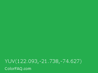 YUV 122.093,-21.738,-74.627 Color is a normal green color and the nearest color is Wageningen Green #34b233. Hex code #25ae4e and RGB value is rgb(37,174,78). In RGB color space, this color is composed of 15% red, 68% green, 31% blue, In CMYK color space, this color is composed of 79% cyan, 0% magenta, 55% yellow , 32% black , In HSL color space, this color has a hue angle of 138° , 65% saturation and 41% lightness.